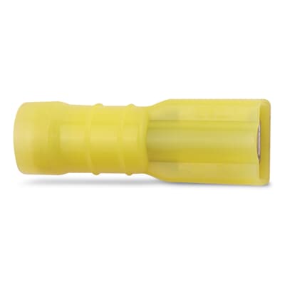 Nylon Fully Insulated Female Disconnect, Length 1.04 Inches, Width .38 Inches, Maximum Insulation .225, Tab Size .250X.032, Wire Range #12-#10 Awg, Color Yellow, Brass, Tin Plated